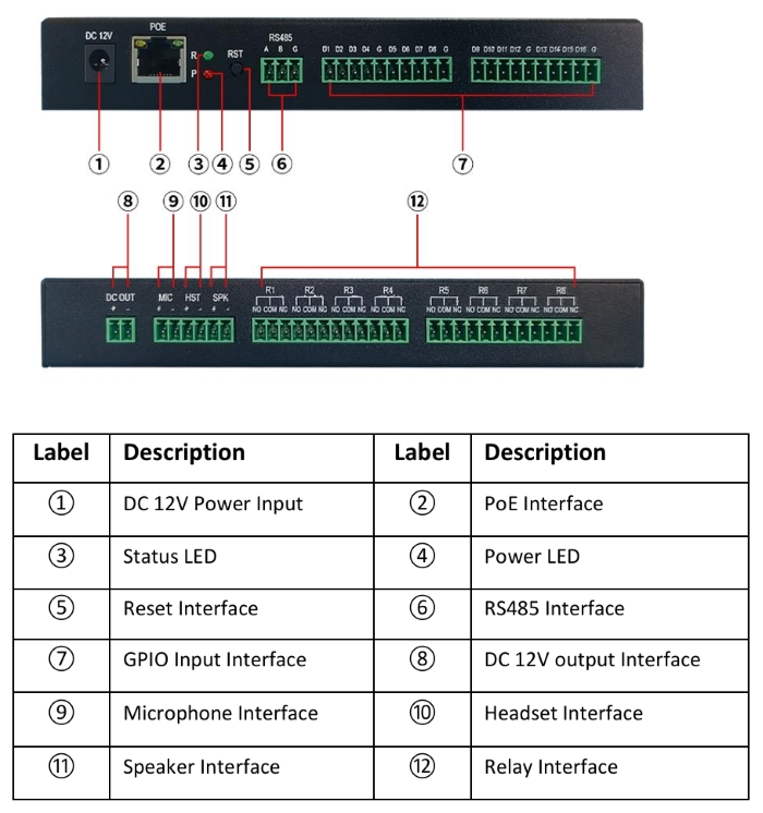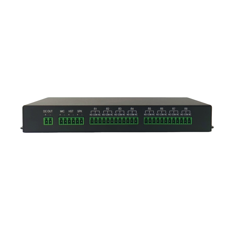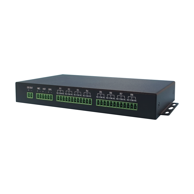 مدخل ميكروفون واحد، مخرج سماعة رأس واحد، مخرج مكبر صوت واحد، 8 مرحلات، 16 مدخل إنذار GPIO، مخرج تيار مستمر واحد، منفذ RS485 واحد، زر إعادة ضبط واحد |